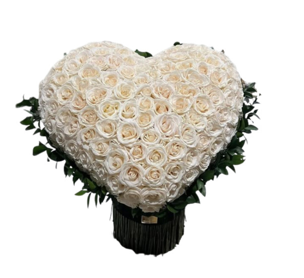 This stunning heart-shaped arrangement is crafted entirely from premium white roses, symbolizing sincerity, loyalty, and everlasting affection.
